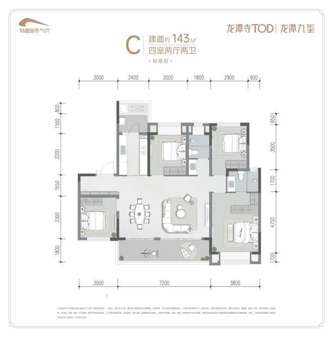 143㎡的改善户型,采用大横厅设计,宽幕采光,两个卧室全向主景观面,拥有长达14米的观景距离。该户型打造的酒店式套房主卧系统,将独立卫浴系统、衣帽间囊括其中,视线绝佳的居住体验。