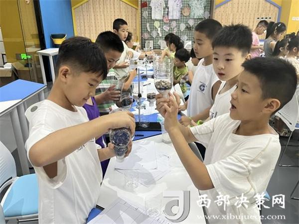 科技营二期成员在《水源净化!脏水变变变》课程中以小组为单位开展对照试验,验证不同滤材对水净化的不同作用。渭南市科技馆供图