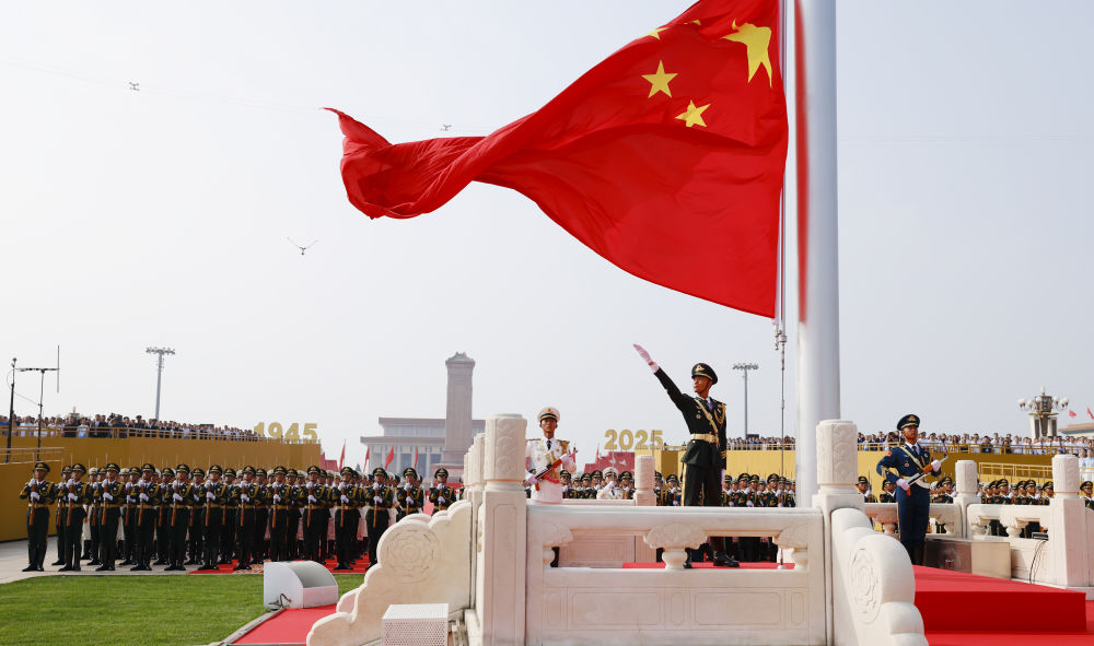 2025年9月3日,纪念中国人民抗日战争暨世界反法西斯战争胜利80周年大会在北京隆重举行。这是广场举行隆重的升国旗仪式。新华社记者 费茂华 摄
