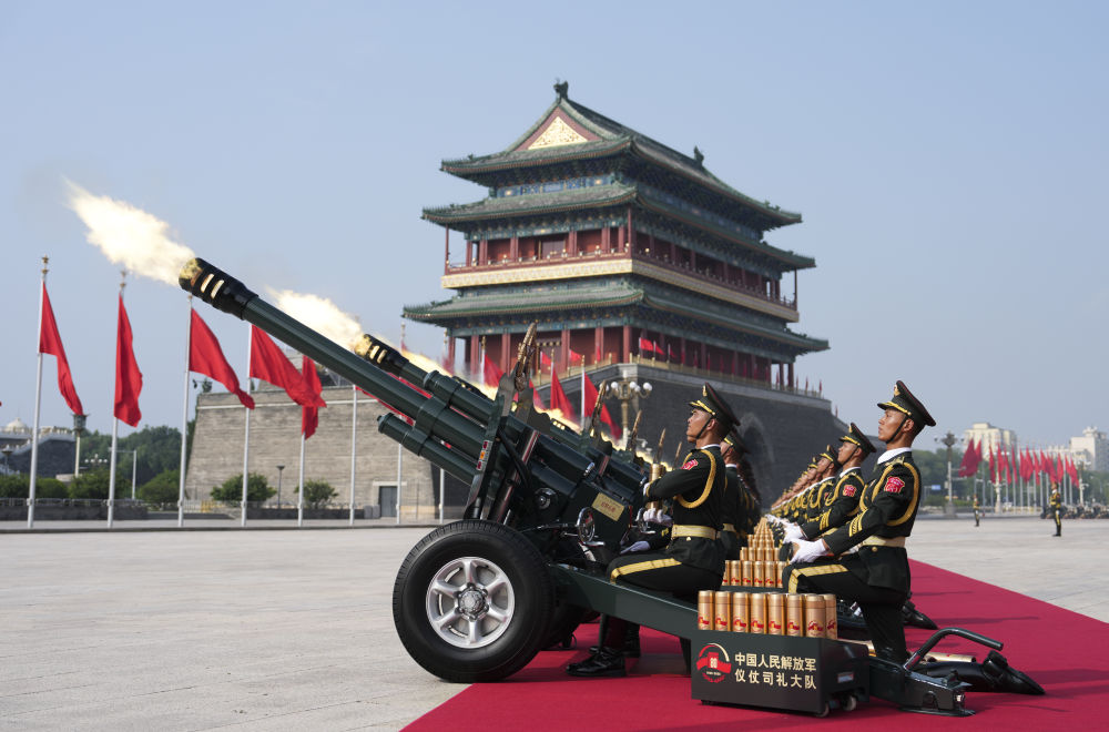2025年9月3日,纪念中国人民抗日战争暨世界反法西斯战争胜利80周年大会在北京隆重举行。这是礼炮在广场鸣响。新华社记者 牟宇 摄