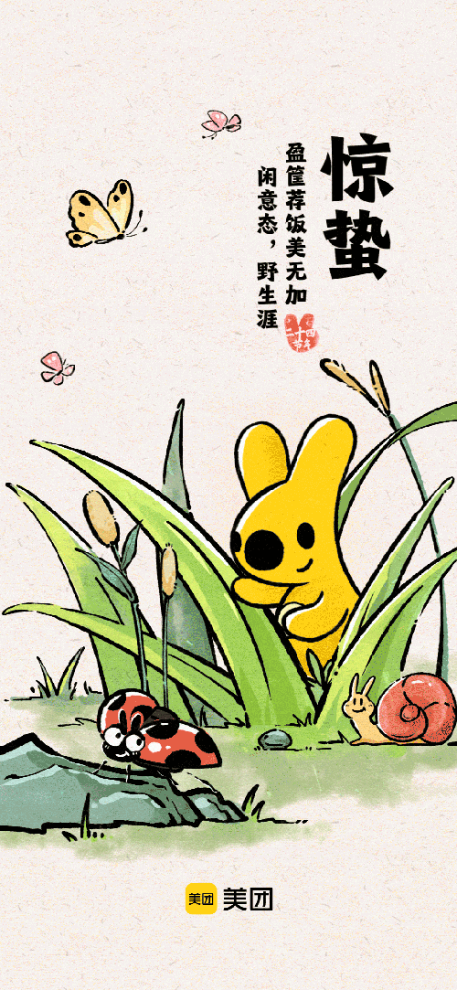 全速为美团打造二十四节气插画海报设计,以仿水墨风的国画小品风格展现节气特有民俗及物候,用“长是江南逢此日,满林烟雨熟枇杷”等诗意短句注入文化内涵,并结合动效设计将迷你版美团IP“袋鼠团团”融入微观场景,让品牌标识自然植入生活画面,营造一种温暖氛围,提升用户对品牌的好感度。